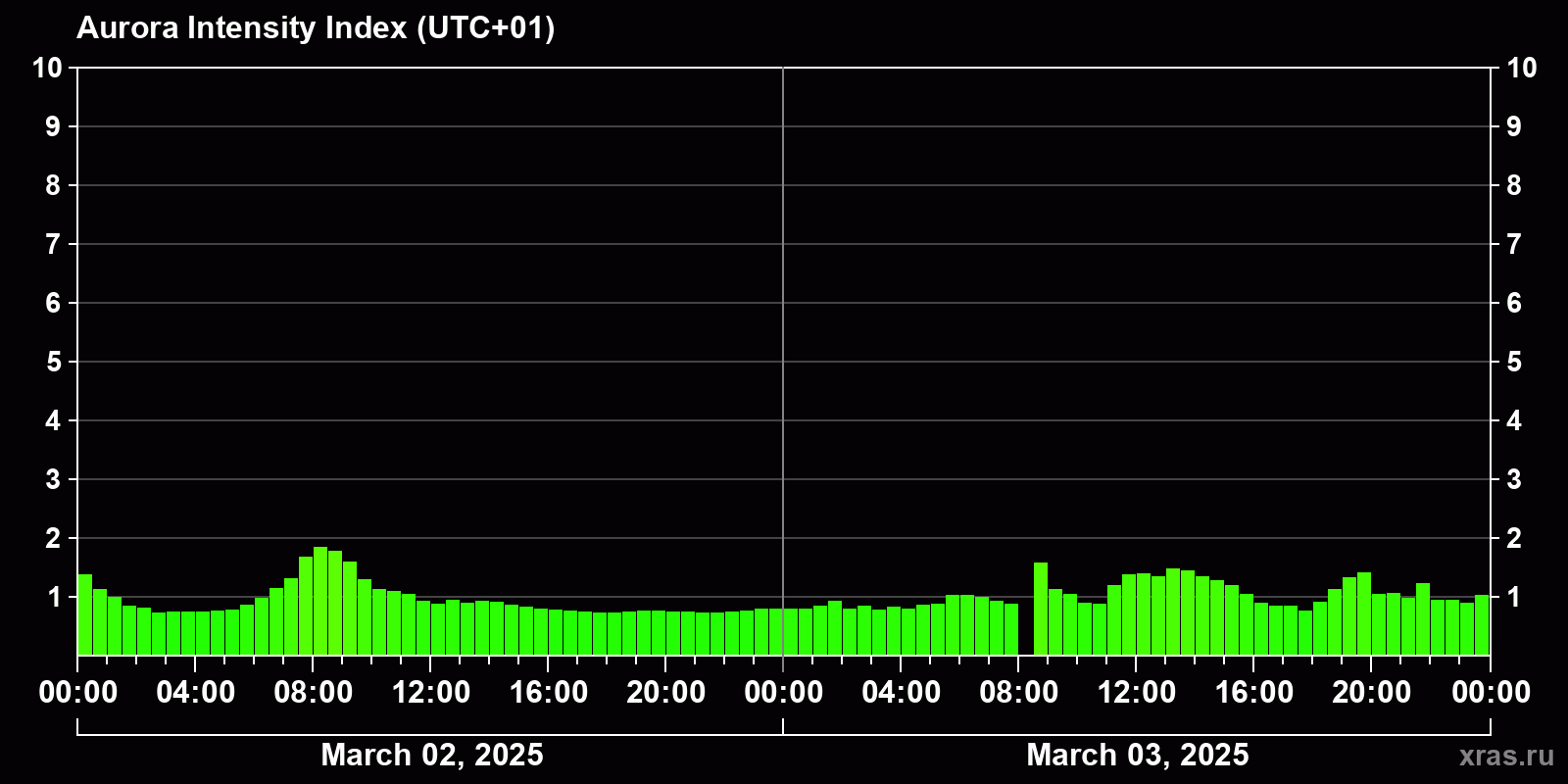 Changes in the auroral intensity index from 2025-03-02 to 2025-03-03 local time