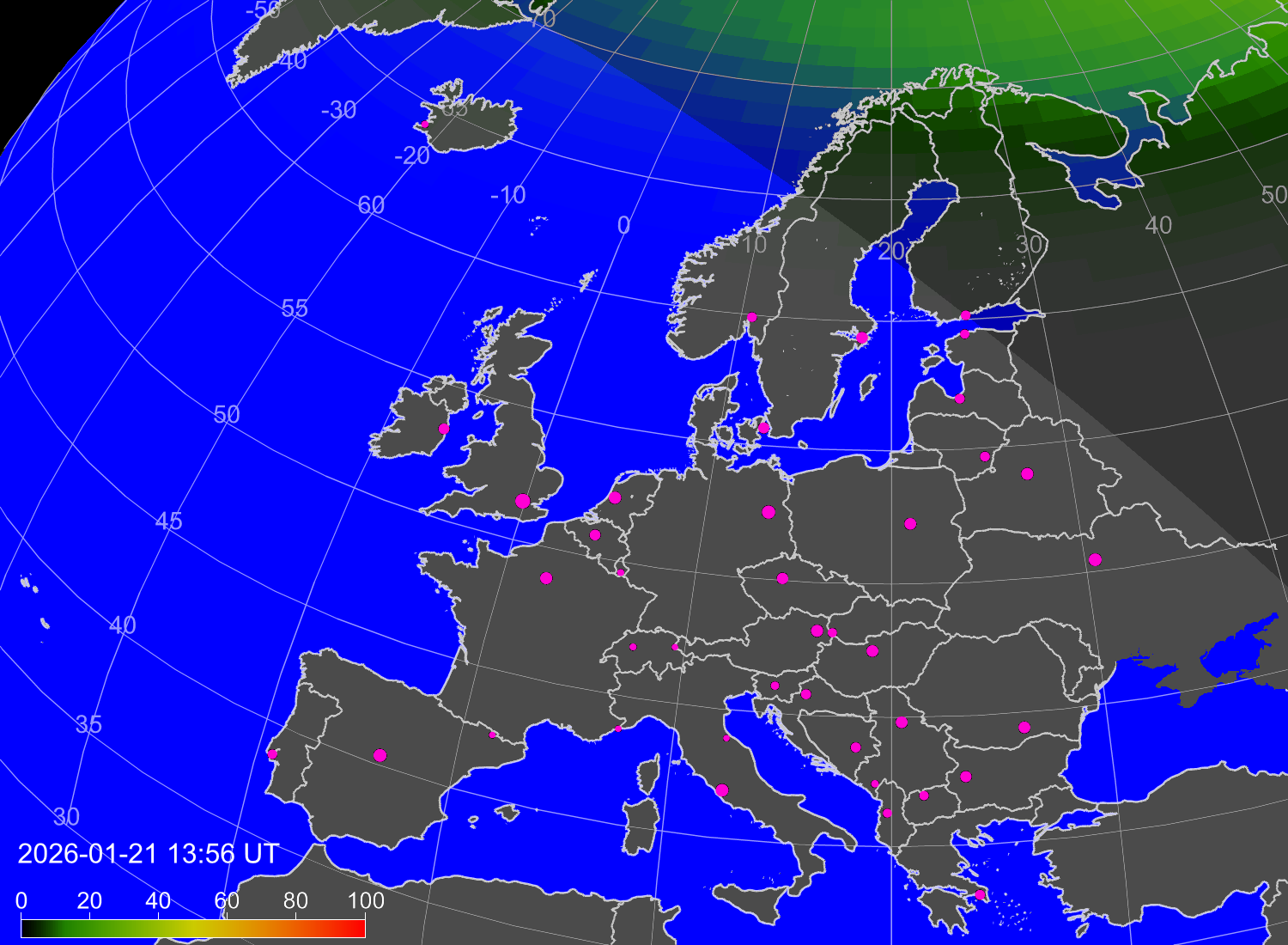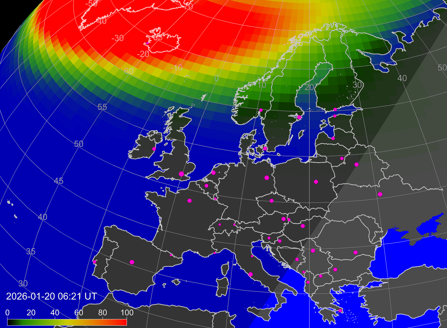 Вероятность полярных сияний в городах Европы