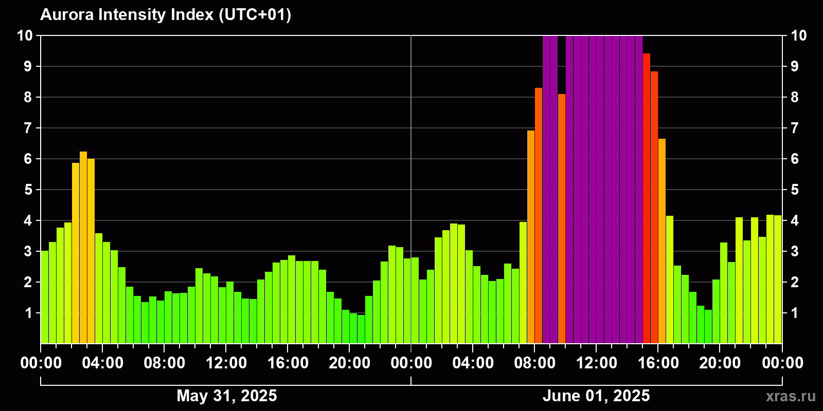 Changes in the auroral intensity index from 2025-05-31 to 2025-06-01 local time