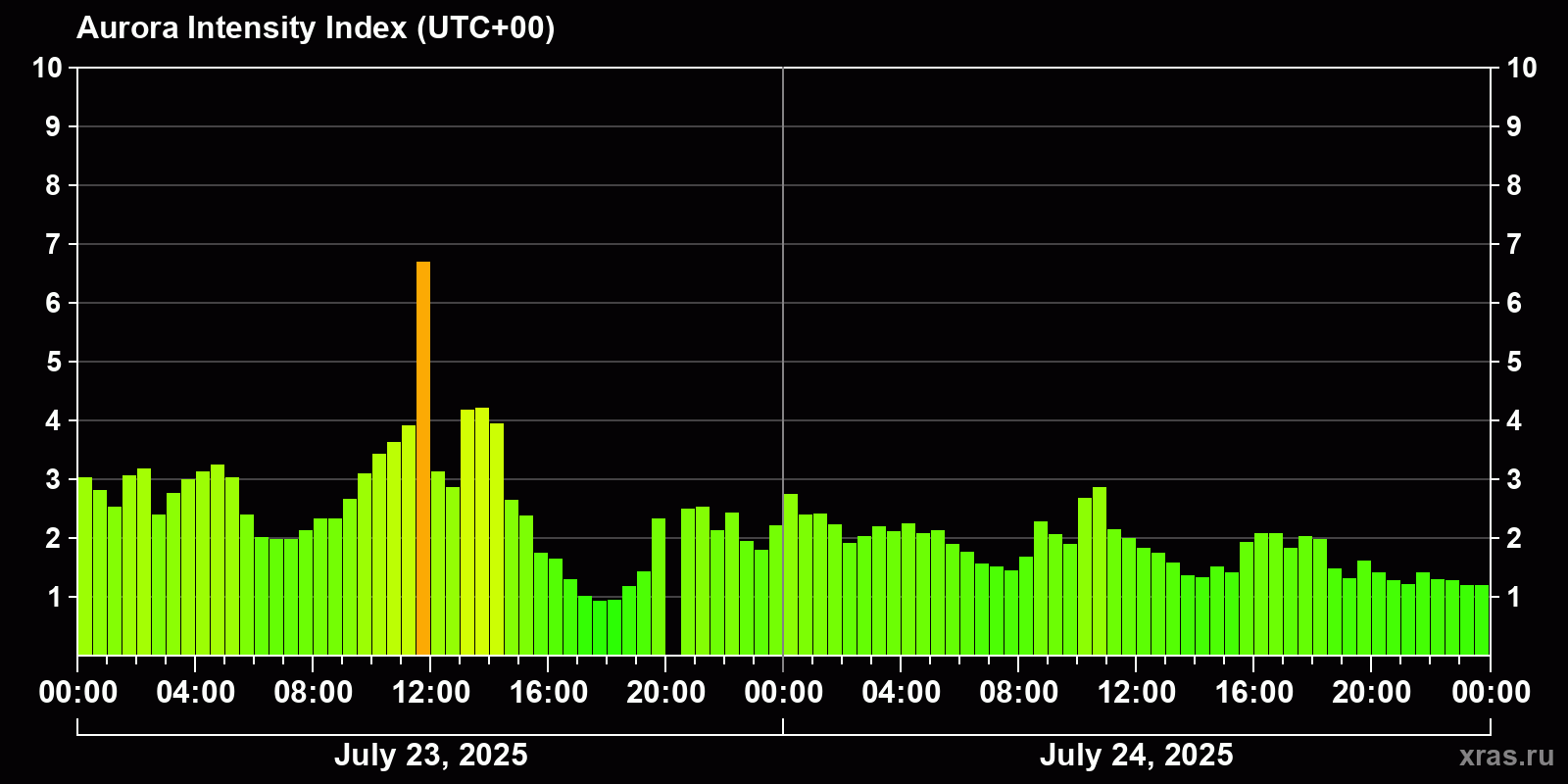 Auroral intensity index and the theoretically possible latitude of observations for nighttime in the Estern Hemisphere as of 2025-07-25 00:50 (end of day) local time