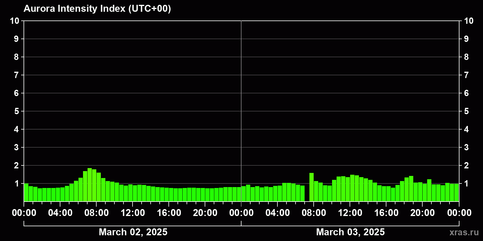 Changes in the auroral intensity index from 2025-03-02 to 2025-03-03 local time