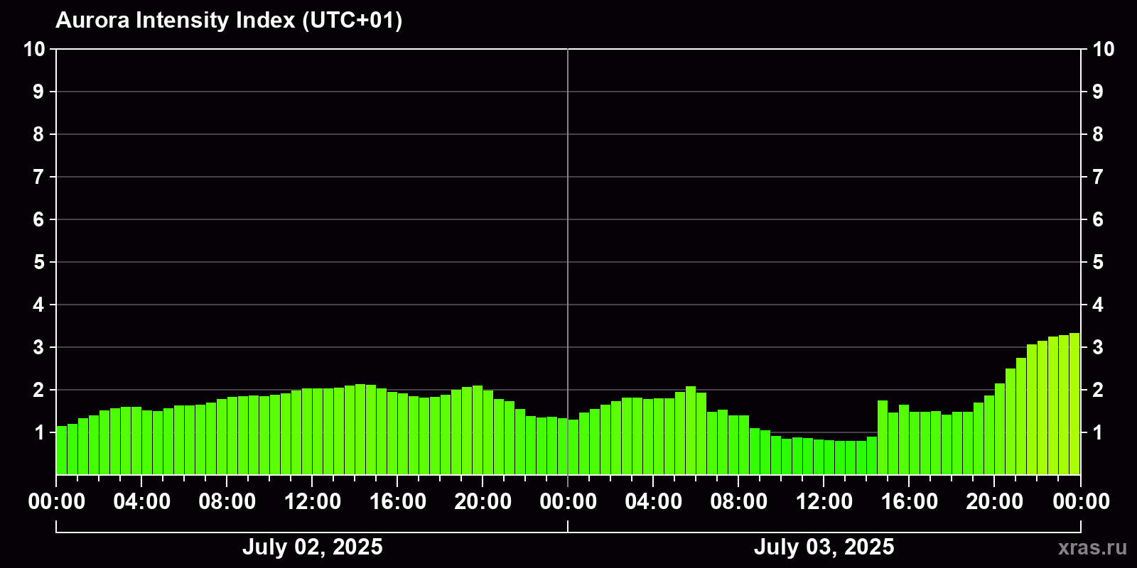 Changes in the auroral intensity index from 2025-07-02 to 2025-07-03 local time