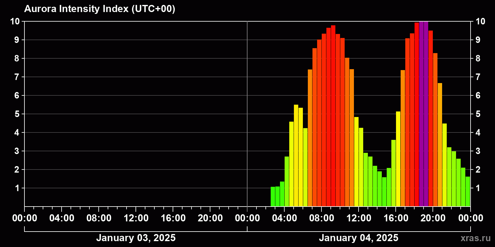 Auroral intensity index and the theoretically possible latitude of observations for nighttime in the Estern Hemisphere as of 2025-01-04 23:53 (end of day) local time
