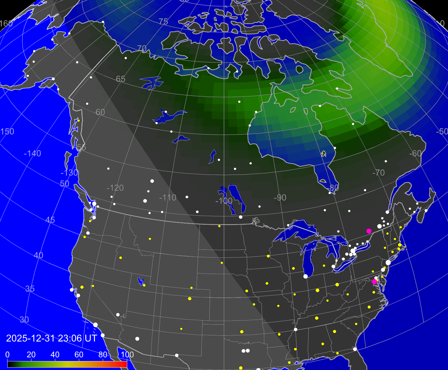 Вероятность полярных сияний в городах Канады