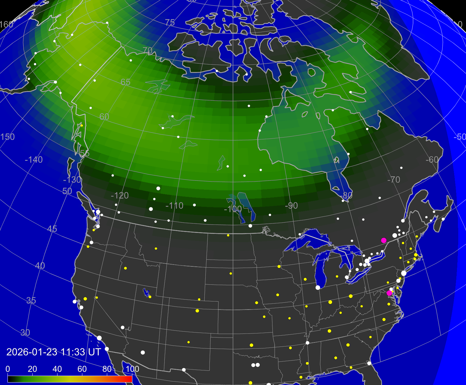 Зона полярных (северных) сияний над территорией Северной Америки