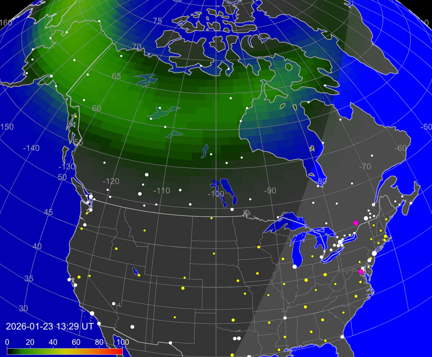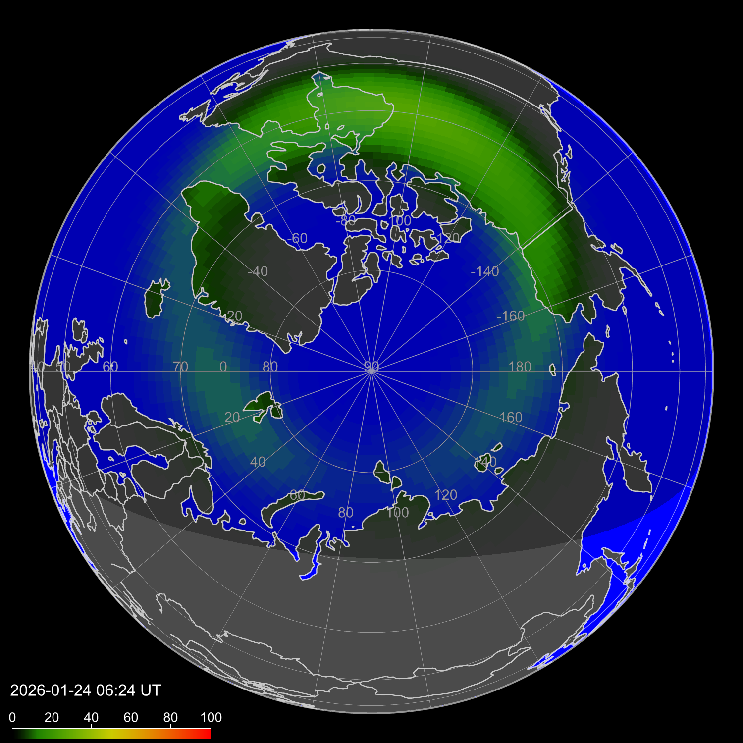 Индекс интенсивности полярных сияний и теоретически возможная широта наблюдений для ночного времени в западном полушарии