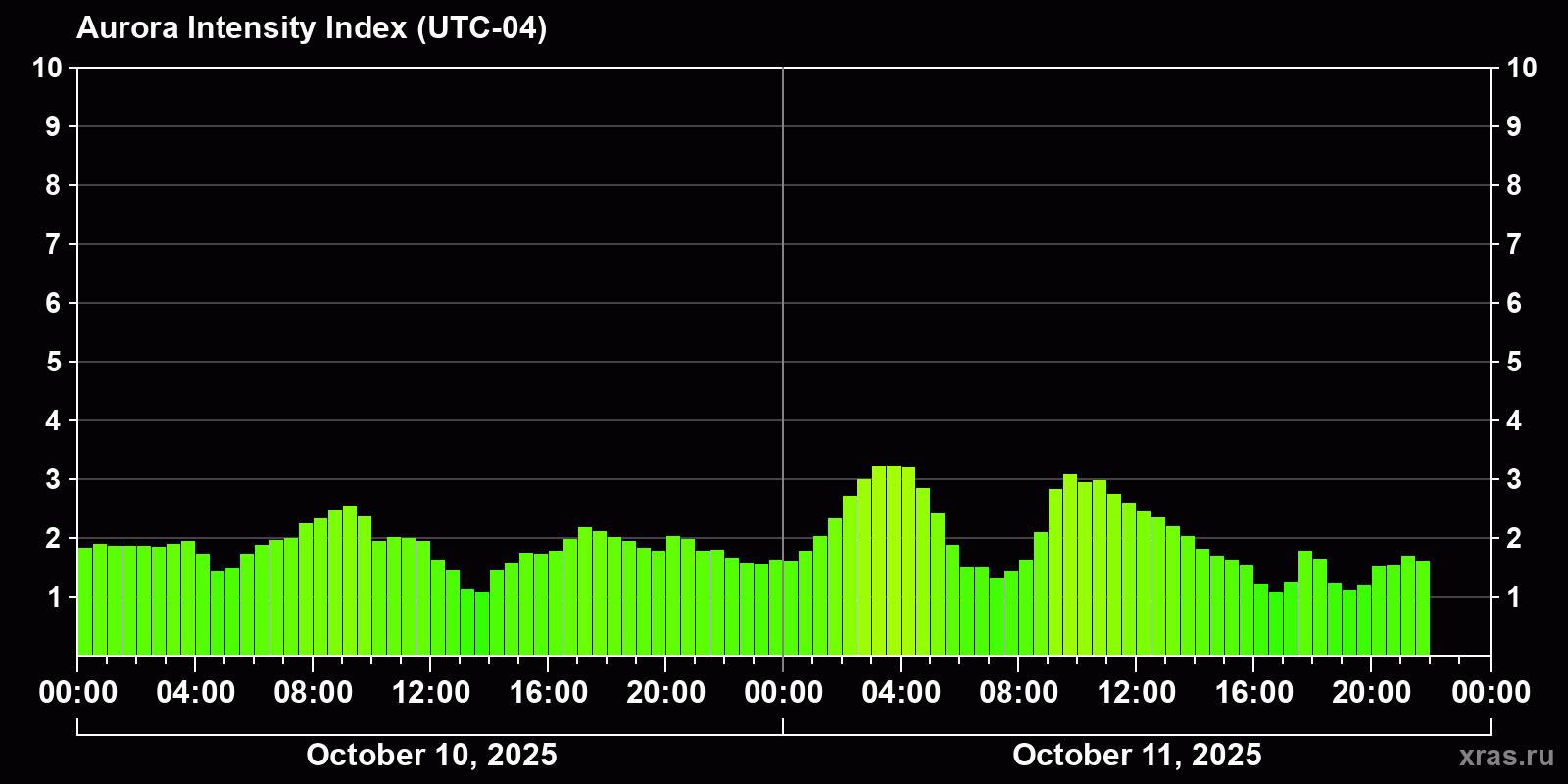 Auroral intensity index and the theoretically possible latitude of observations for nighttime in the Western Hemisphere as of 2025-10-11 19:10 (end of day) local time
