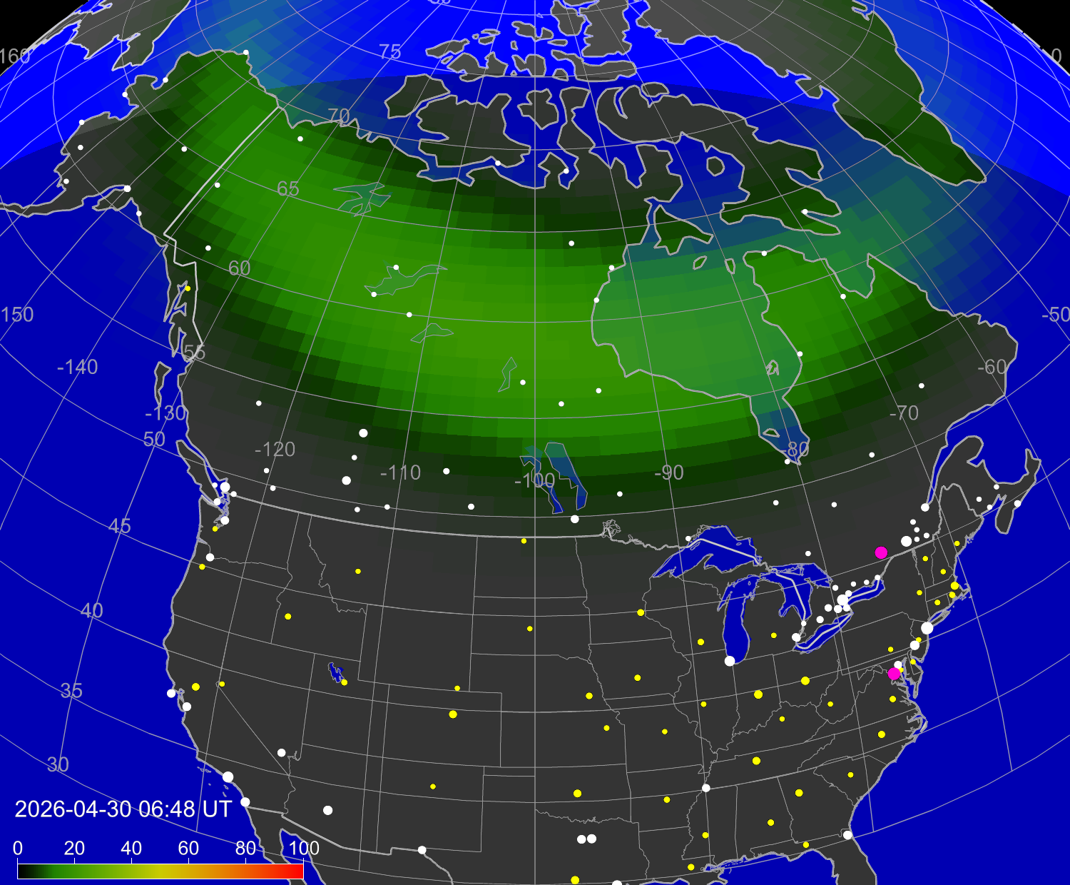 Changes and hourly forecast of the auroral intensity index from 2026-04-28 to 2026-04-29