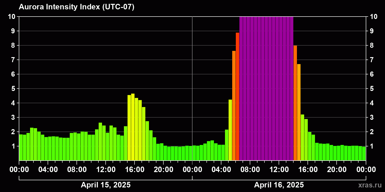 Changes in the auroral intensity index from 2025-04-15 to 2025-04-16 local time