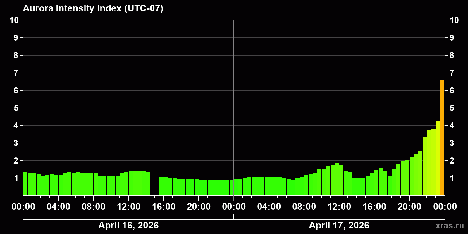 Changes in the auroral intensity index from 2026-04-16 to 2026-04-17 local time