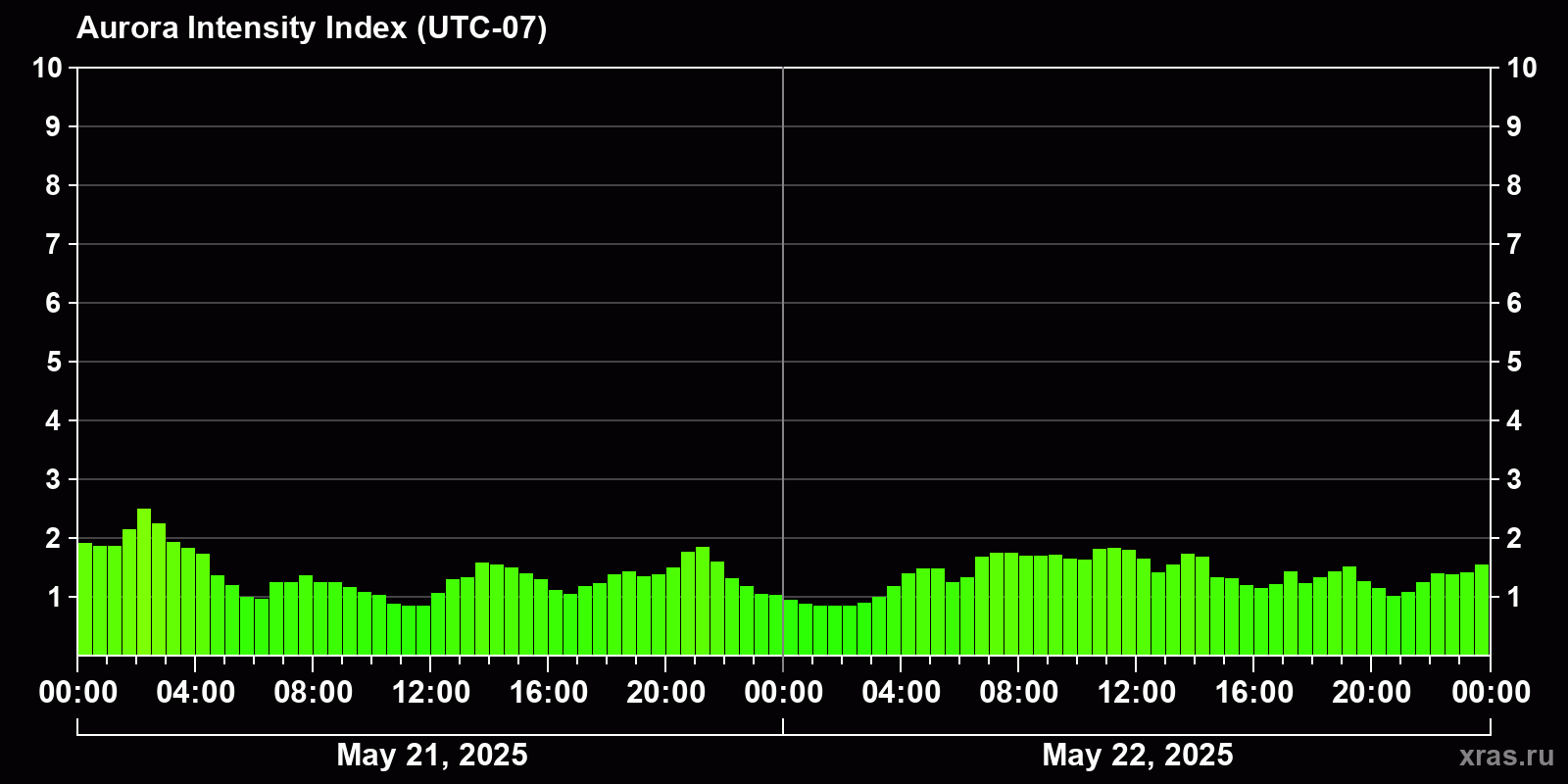 Auroral intensity index and the theoretically possible latitude of observations for nighttime in the Western Hemisphere as of 2025-05-22 23:51 (end of day) local time