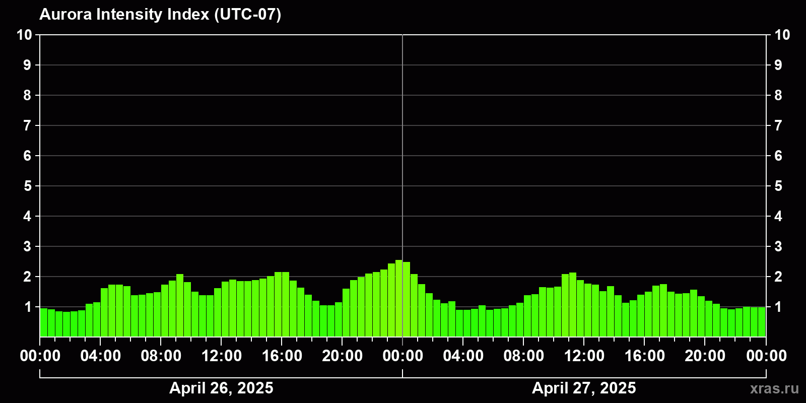 Changes in the auroral intensity index from 2025-04-26 to 2025-04-27 local time
