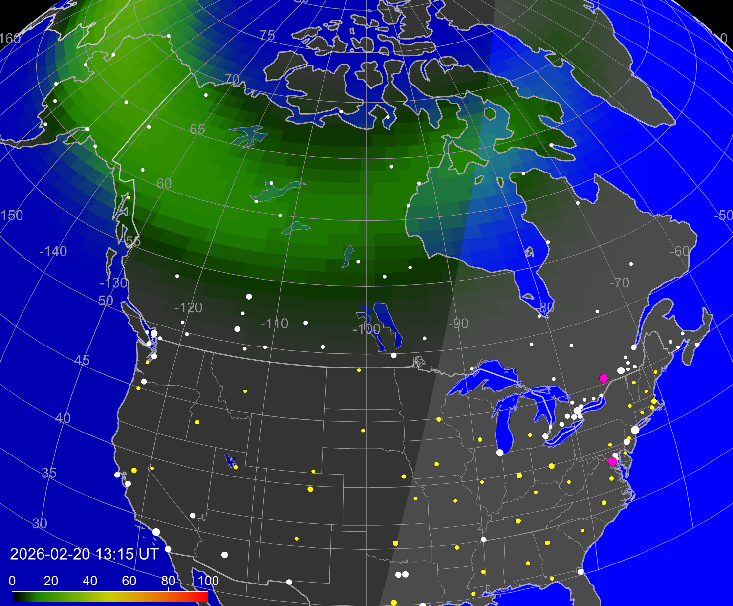 Изменения и часовой прогноз индекса интенсивности полярных сияний с 2026-02-19 по 2026-02-20
