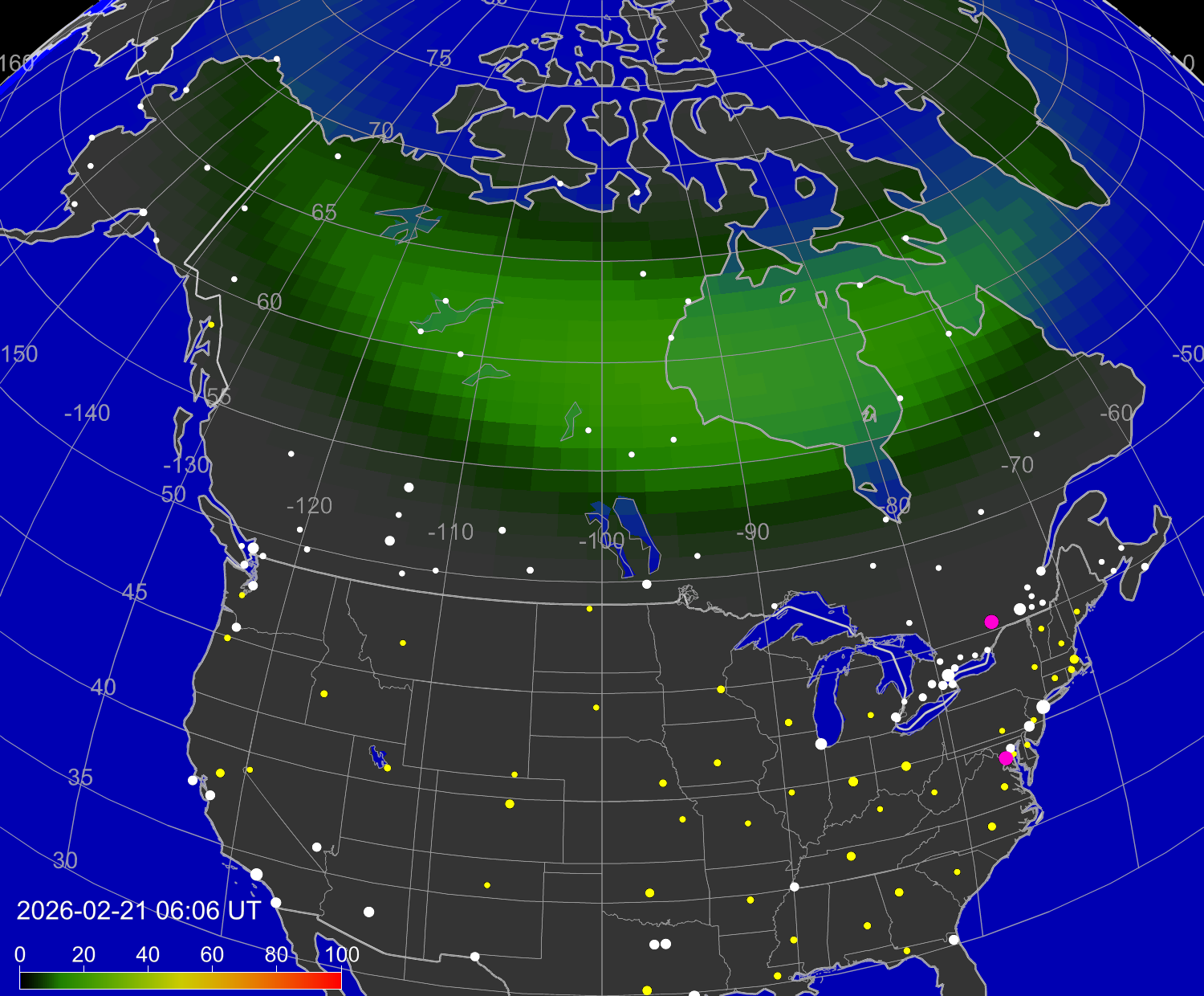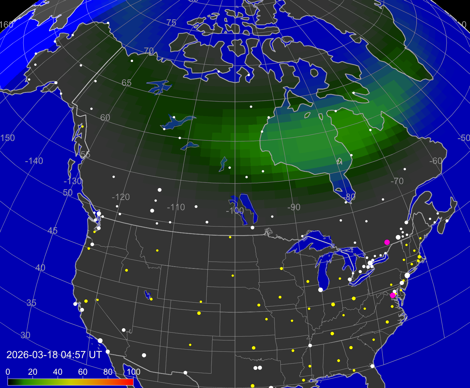Индекс интенсивности полярных сияний и теоретически возможная широта наблюдений для ночного времени в западном полушарии