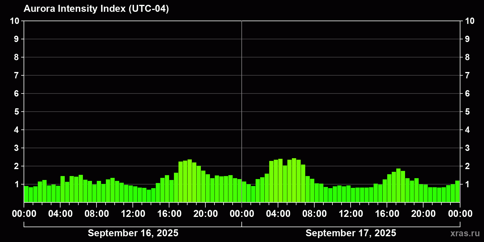 Changes in the auroral intensity index from 2025-09-16 to 2025-09-17 local time