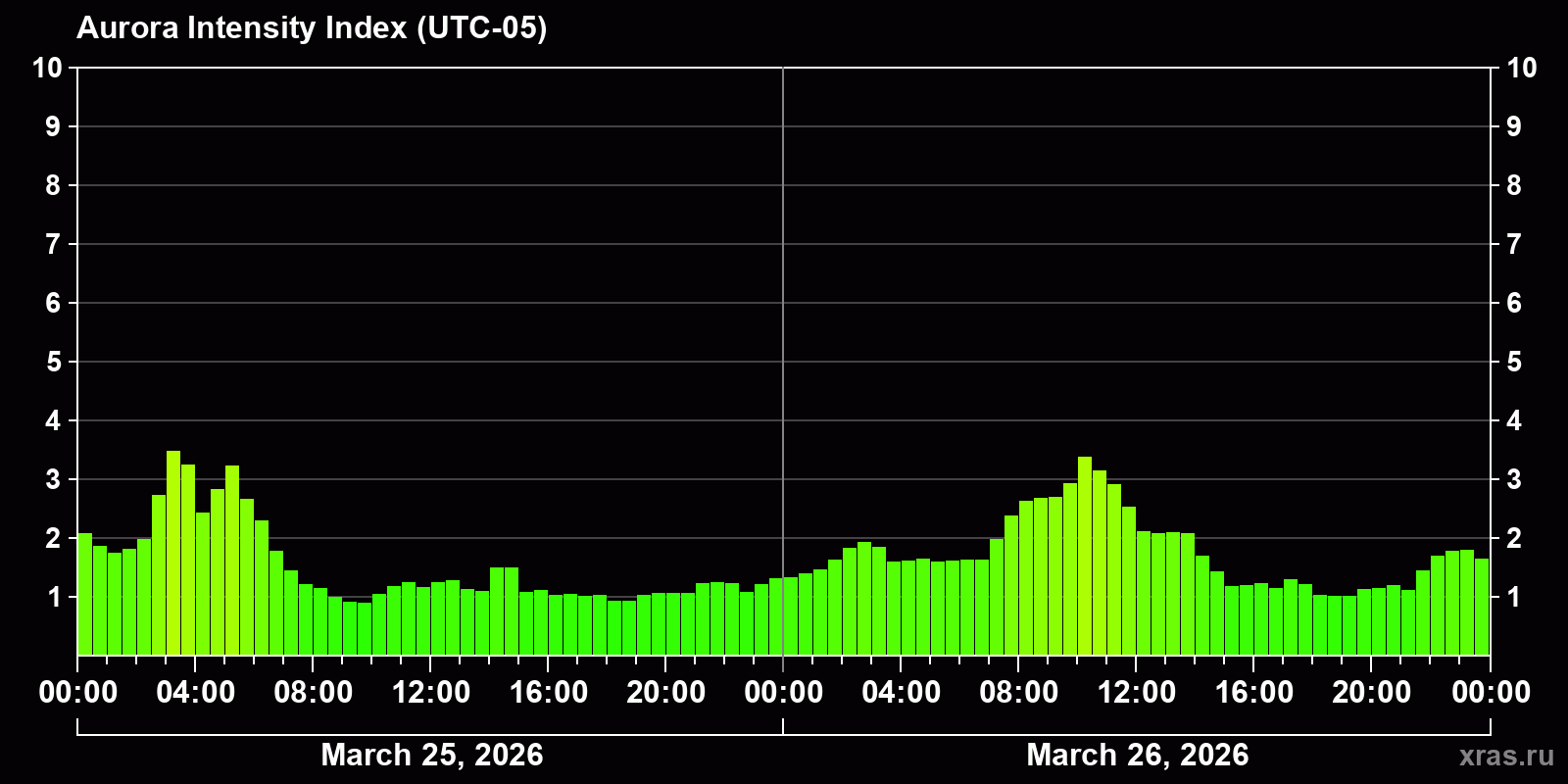 Auroral intensity index and the theoretically possible latitude of observations for nighttime in the Western Hemisphere as of 2026-03-26 23:58 (end of day) local time