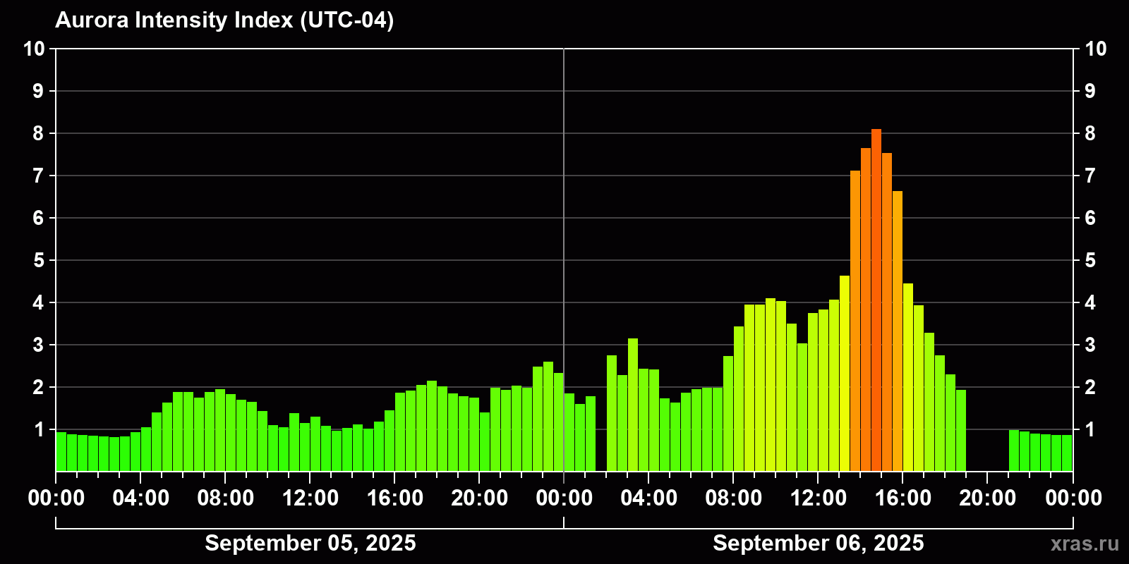 Changes in the auroral intensity index from 2025-09-05 to 2025-09-06 local time