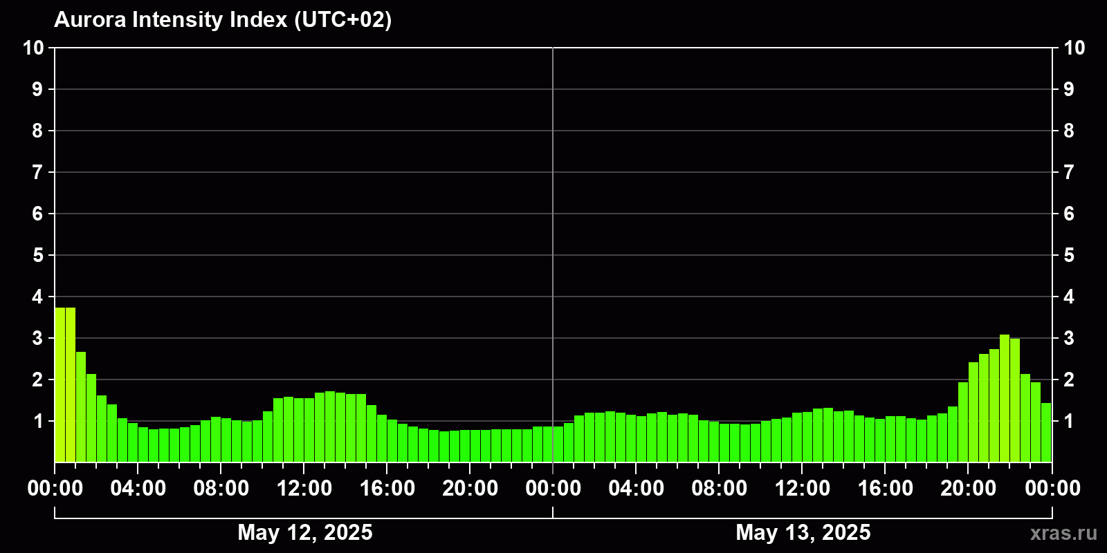 Auroral intensity index and the theoretically possible latitude of observations for nighttime in the Estern Hemisphere as of 2025-05-13 23:45 (end of day) local time
