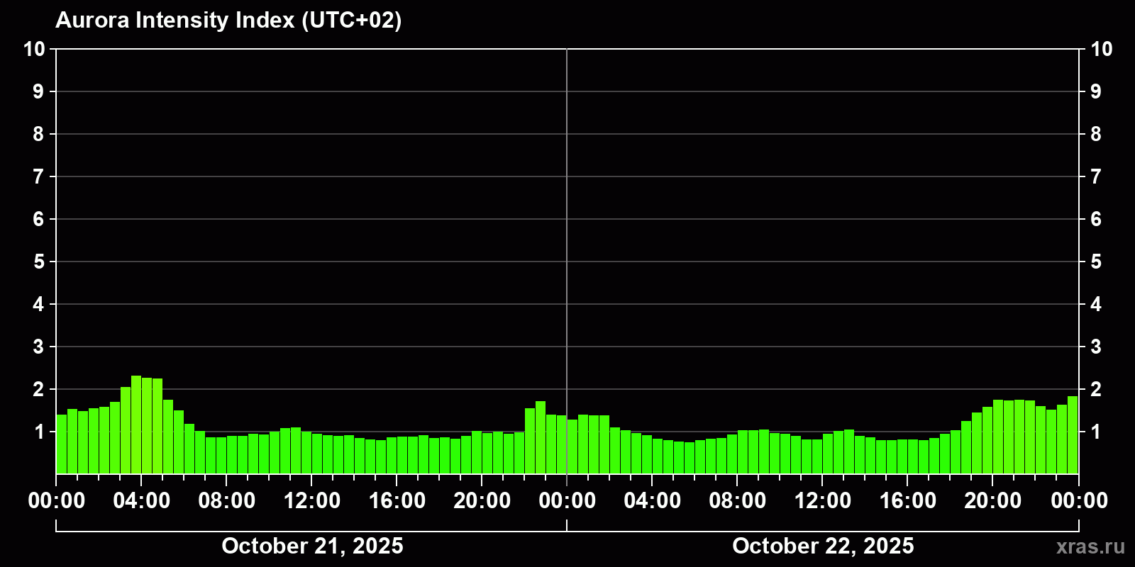 Changes in the auroral intensity index from 2025-10-21 to 2025-10-22 local time