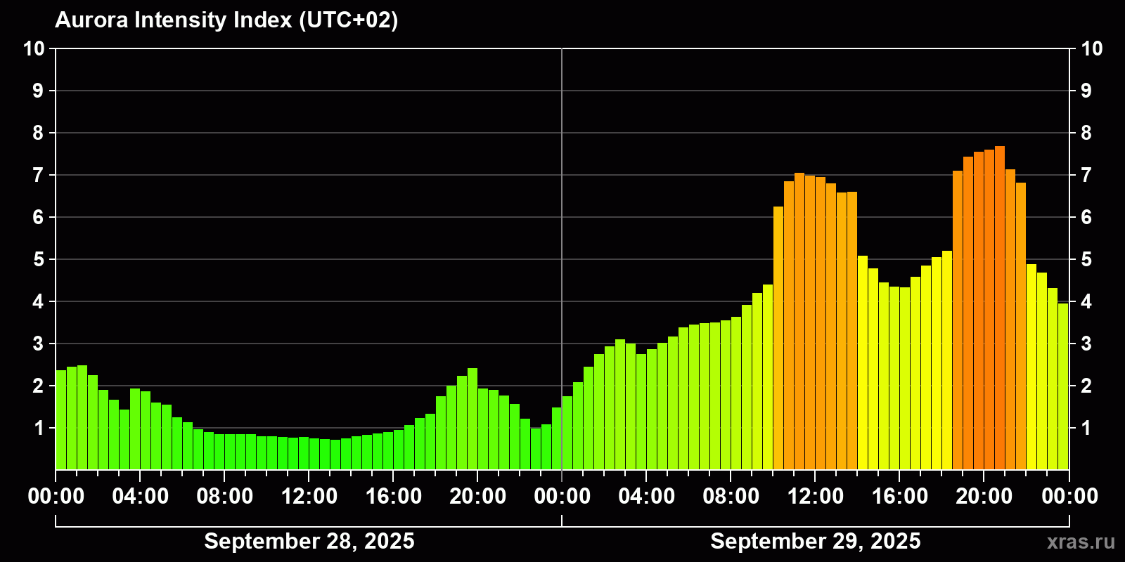 Auroral intensity index and the theoretically possible latitude of observations for nighttime in the Estern Hemisphere as of 2025-09-29 23:53 (end of day) local time