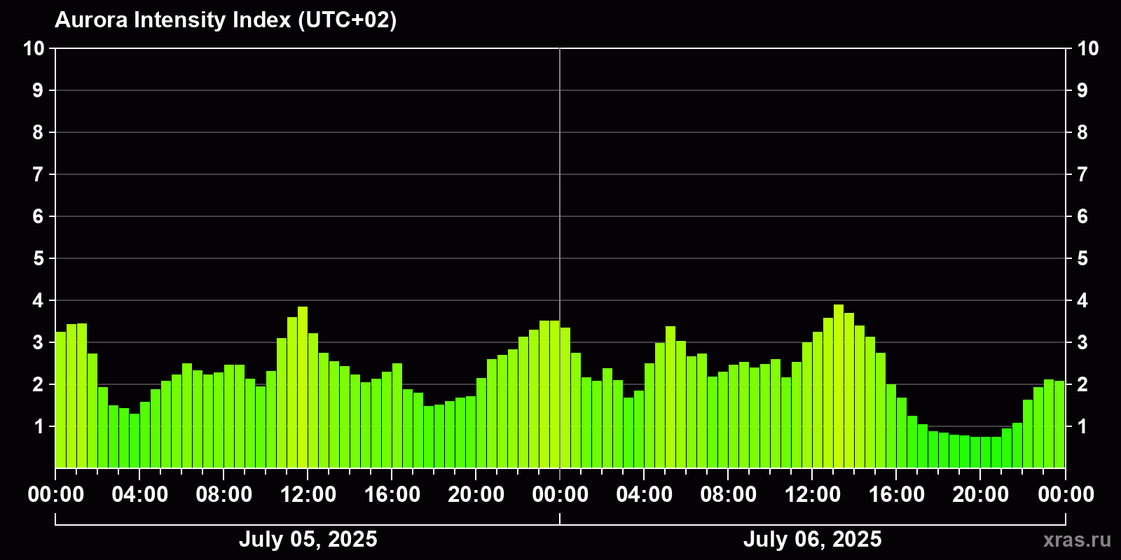 Changes in the auroral intensity index from 2025-07-05 to 2025-07-06 local time