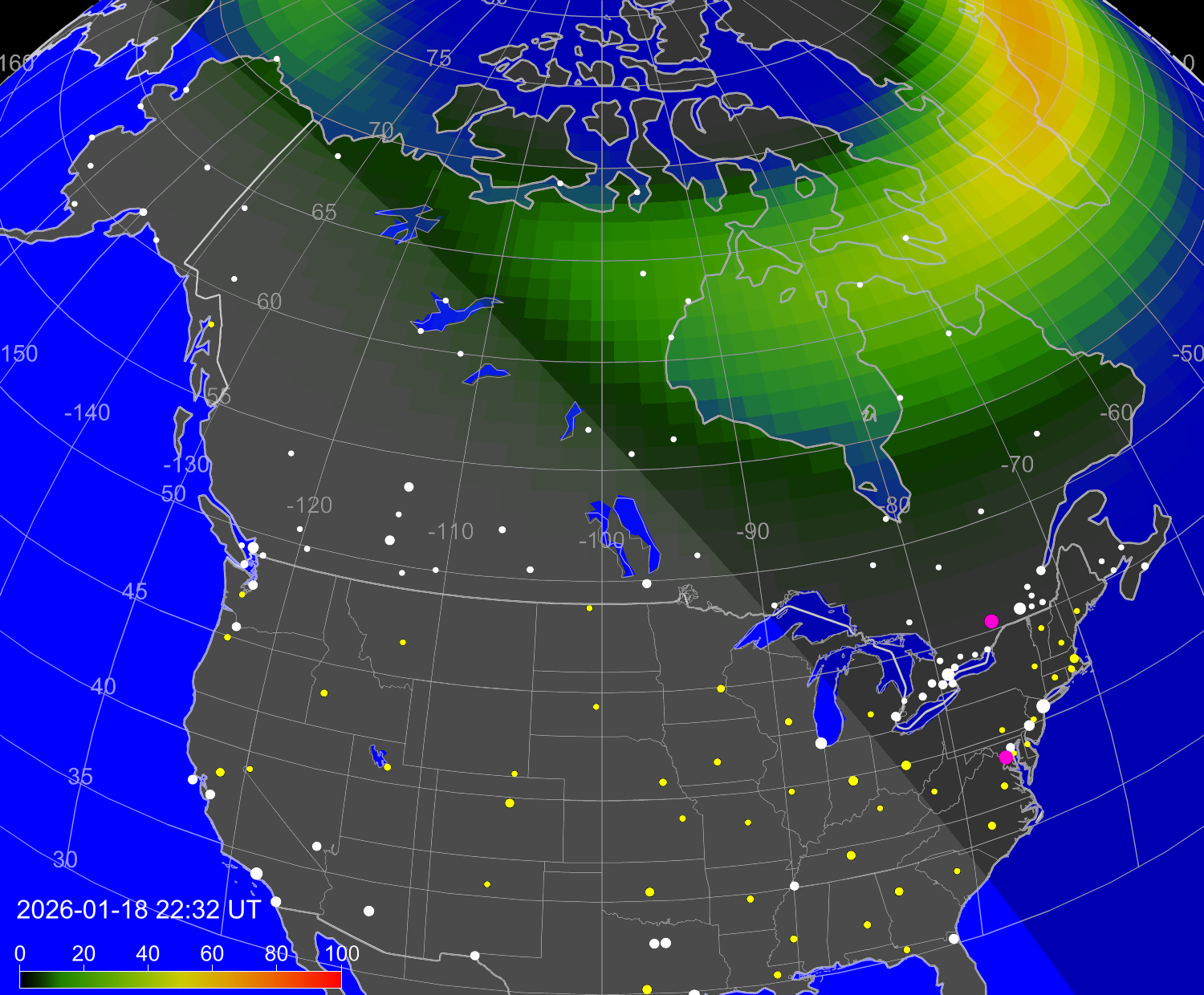 Вероятность полярных сияний в городах Канады