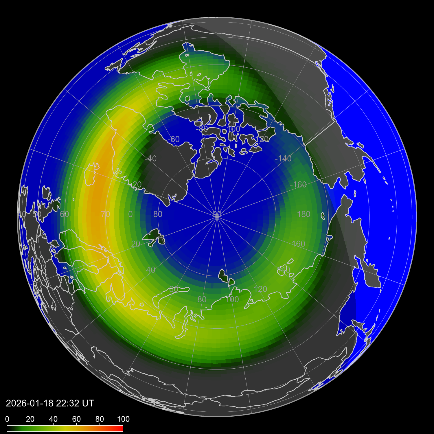 Индекс интенсивности полярных сияний и теоретически возможная широта наблюдений для ночного времени в западном полушарии