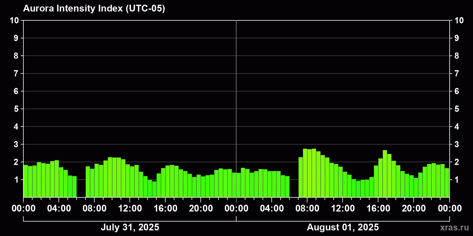 Changes in the auroral intensity index from 2025-07-31 to 2025-08-01 local time
