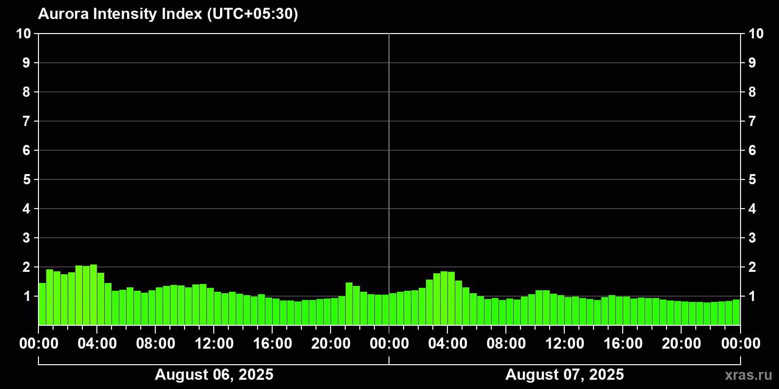 Changes in the auroral intensity index from 2025-08-06 to 2025-08-07 local time