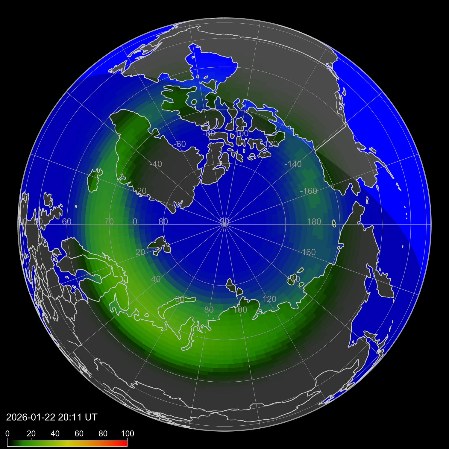 Изменения и часовой прогноз индекса интенсивности полярных сияний с 2026-01-20 по 2026-01-21