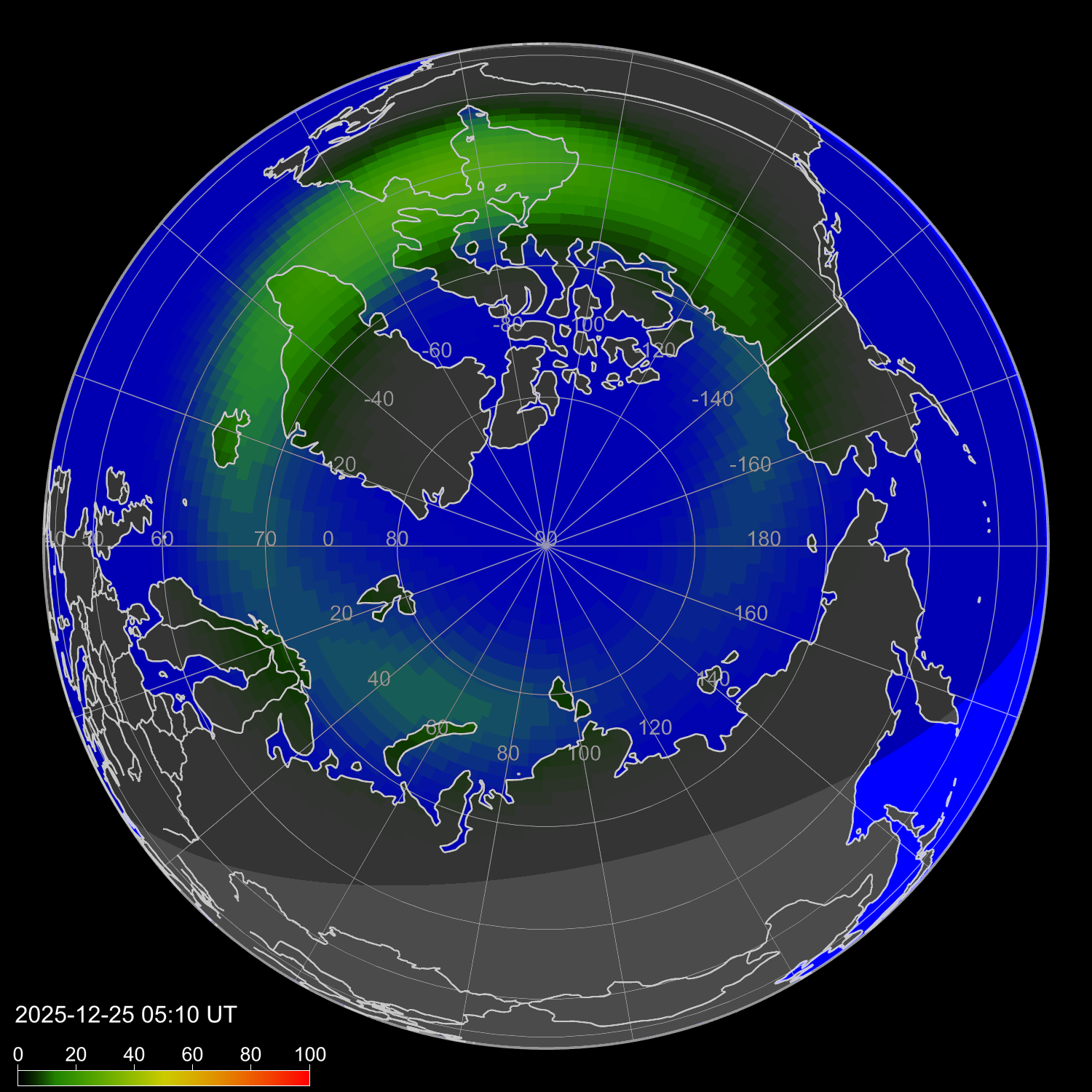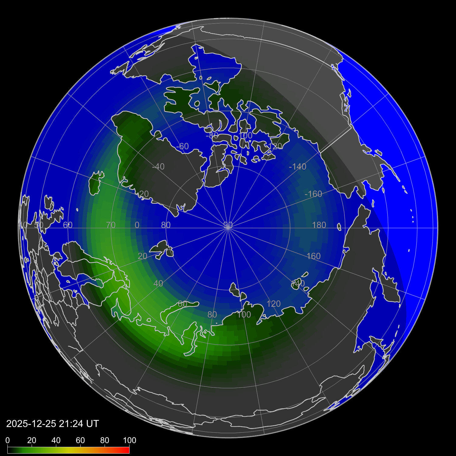 Изменения и часовой прогноз индекса интенсивности полярных сияний с 2025-12-23 по 2025-12-24