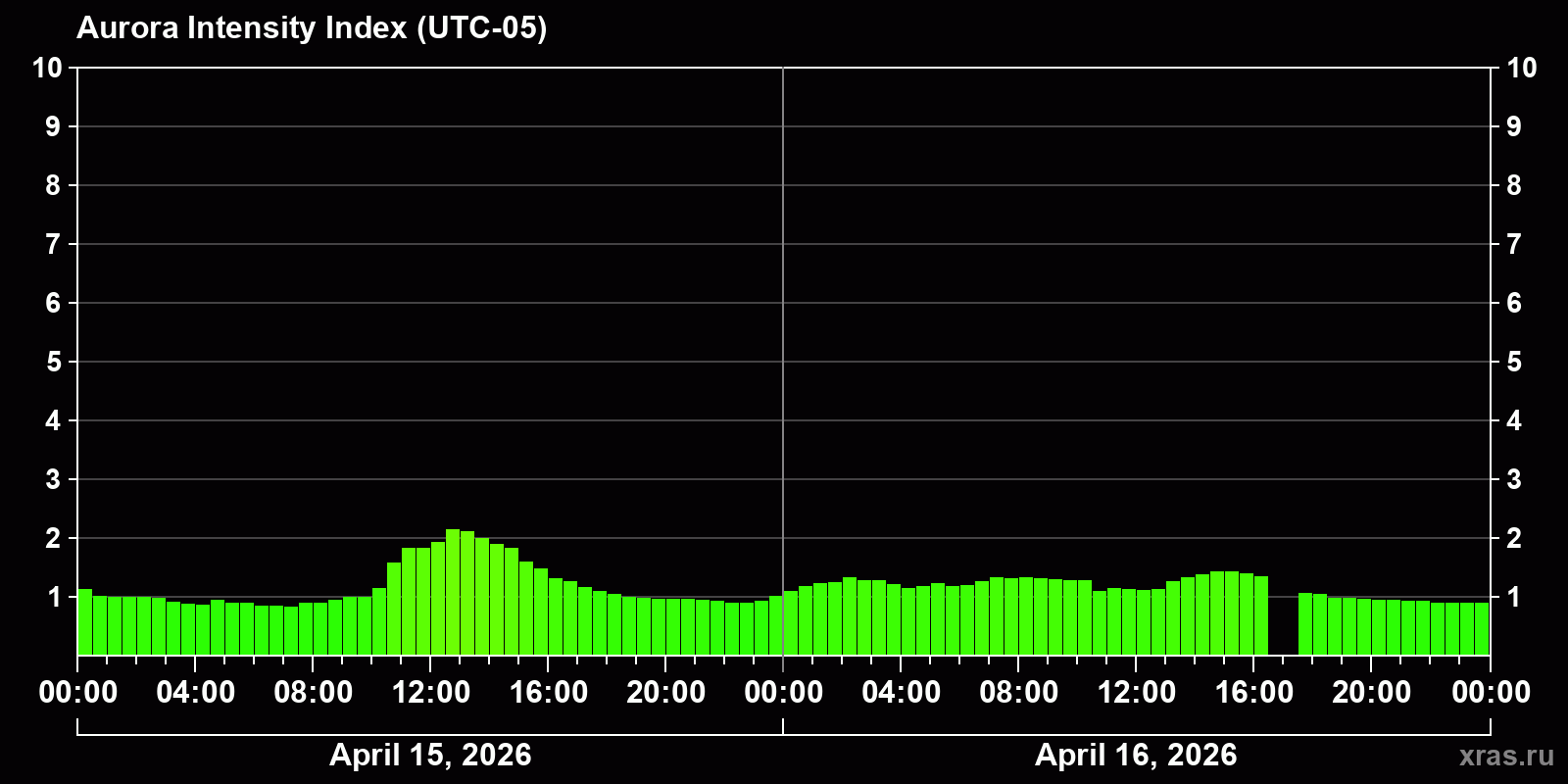 Auroral intensity index and the theoretically possible latitude of observations for nighttime in the Western Hemisphere as of 2026-04-16 23:48 (end of day) local time