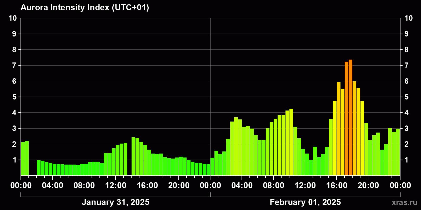 Auroral intensity index and the theoretically possible latitude of observations for nighttime in the Estern Hemisphere as of 2025-02-01 23:45 (end of day) local time