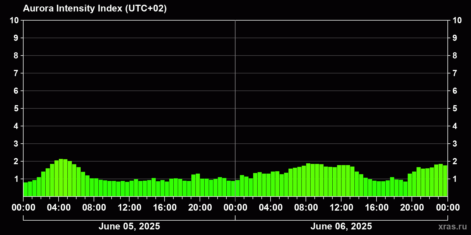 Auroral intensity index and the theoretically possible latitude of observations for nighttime in the Estern Hemisphere as of 2025-06-06 23:55 (end of day) local time