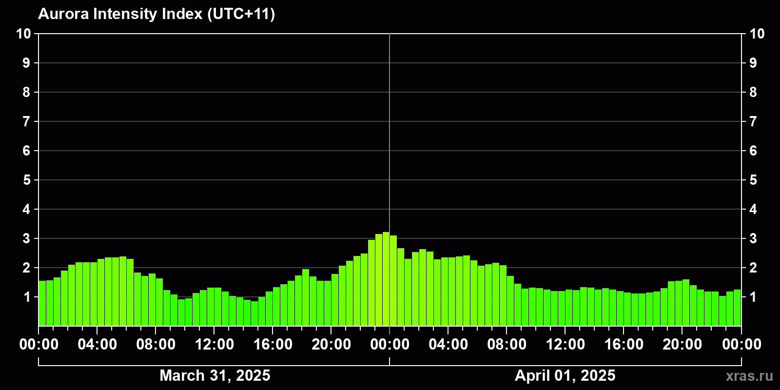 Changes in the auroral intensity index from 2025-03-31 to 2025-04-01 local time