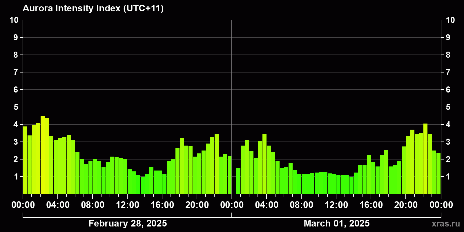 Auroral intensity index and the theoretically possible latitude of observations for nighttime in the Estern Hemisphere as of 2025-03-01 23:46 (end of day) local time
