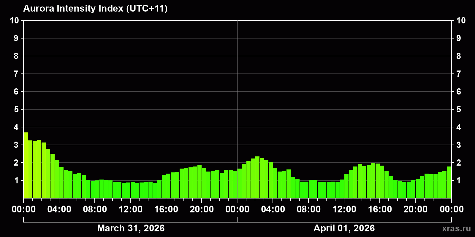 Changes in the auroral intensity index from 2026-03-31 to 2026-04-01 local time