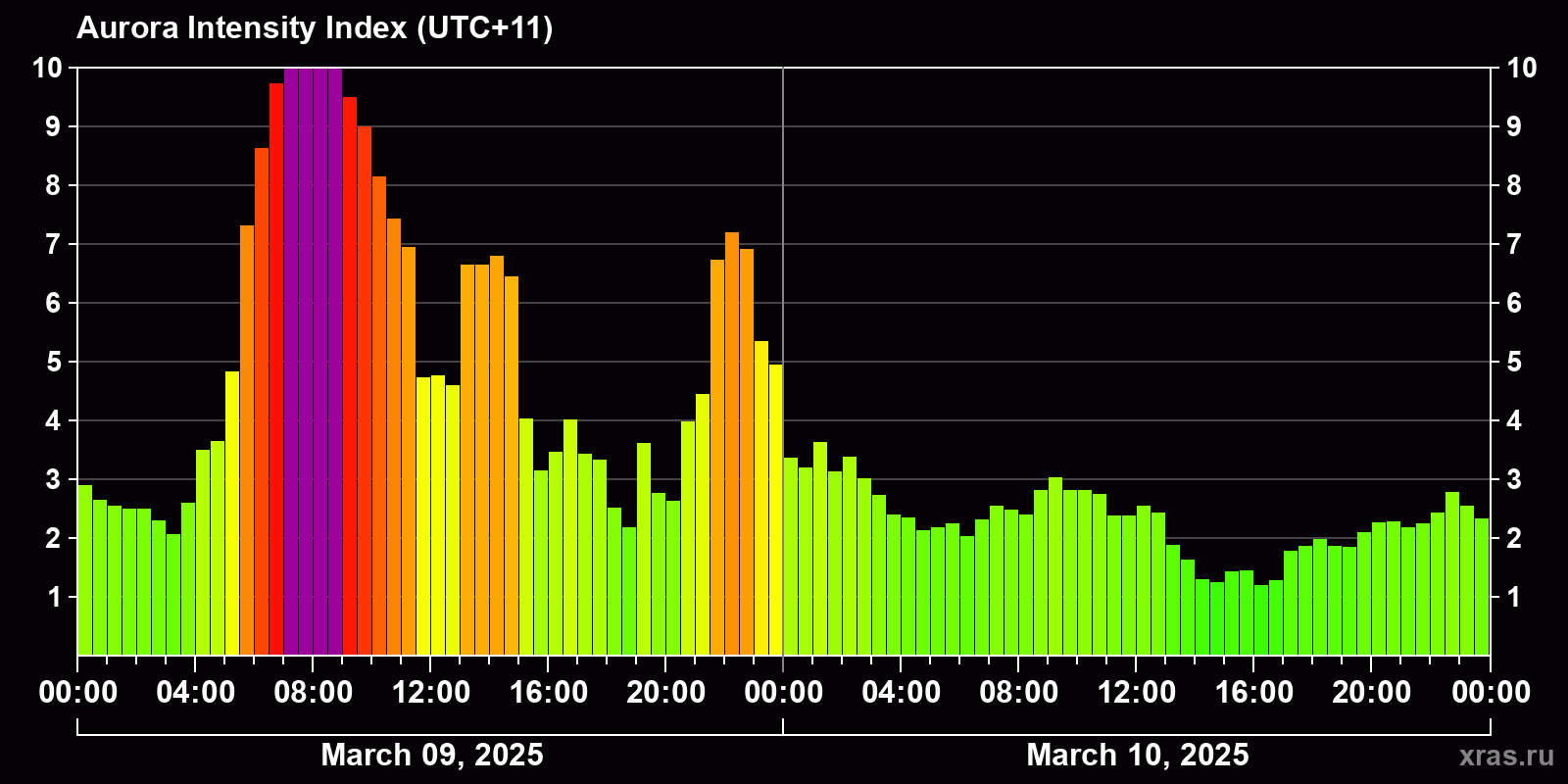 Auroral intensity index and the theoretically possible latitude of observations for nighttime in the Estern Hemisphere as of 2025-03-10 23:50 (end of day) local time