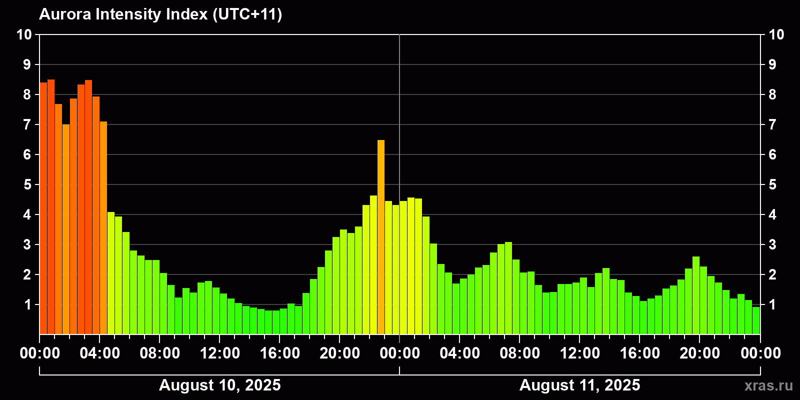 Auroral intensity index and the theoretically possible latitude of observations for nighttime in the Estern Hemisphere as of 2025-08-11 23:48 (end of day) local time