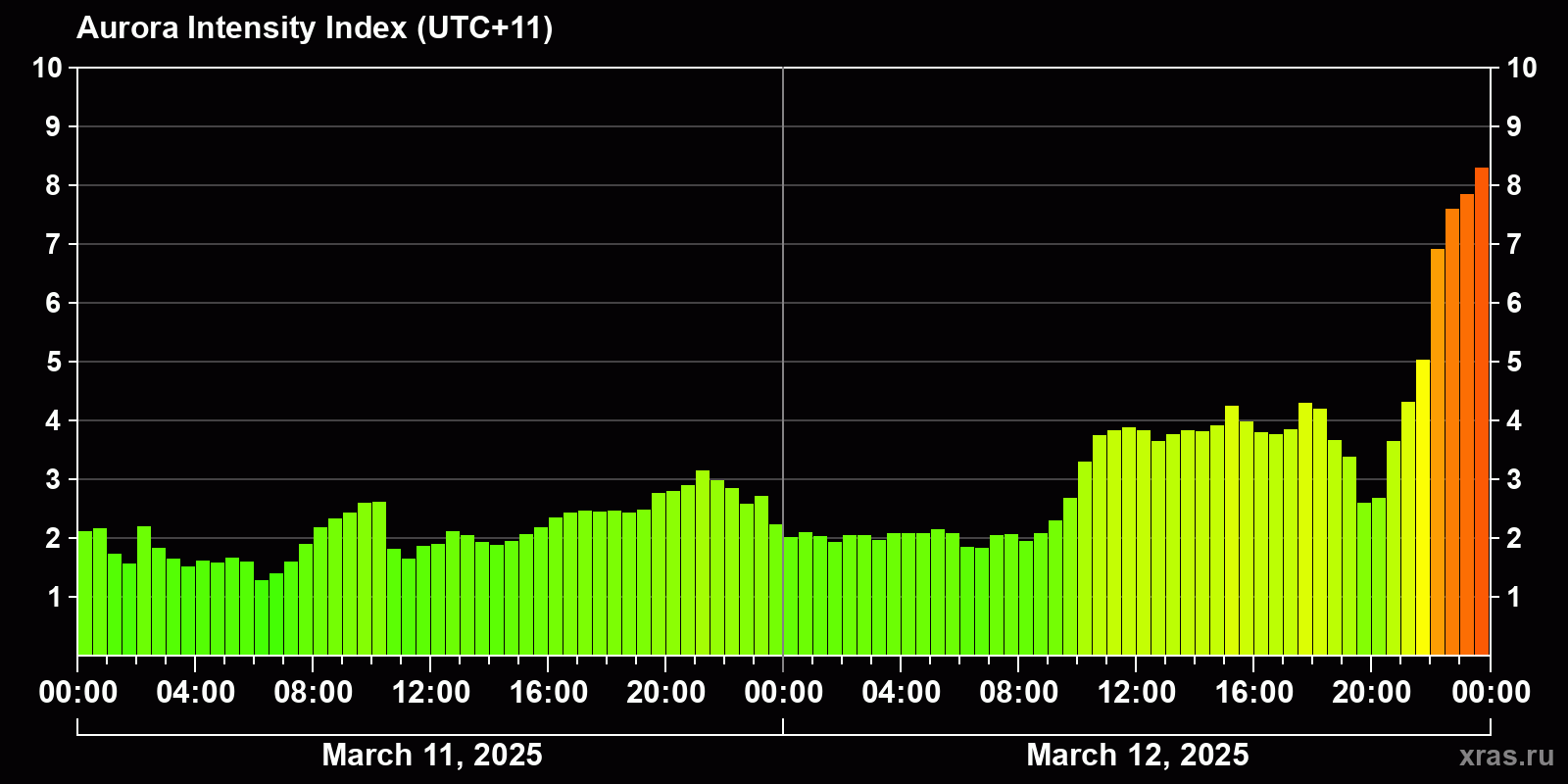 Changes in the auroral intensity index from 2025-03-11 to 2025-03-12 local time