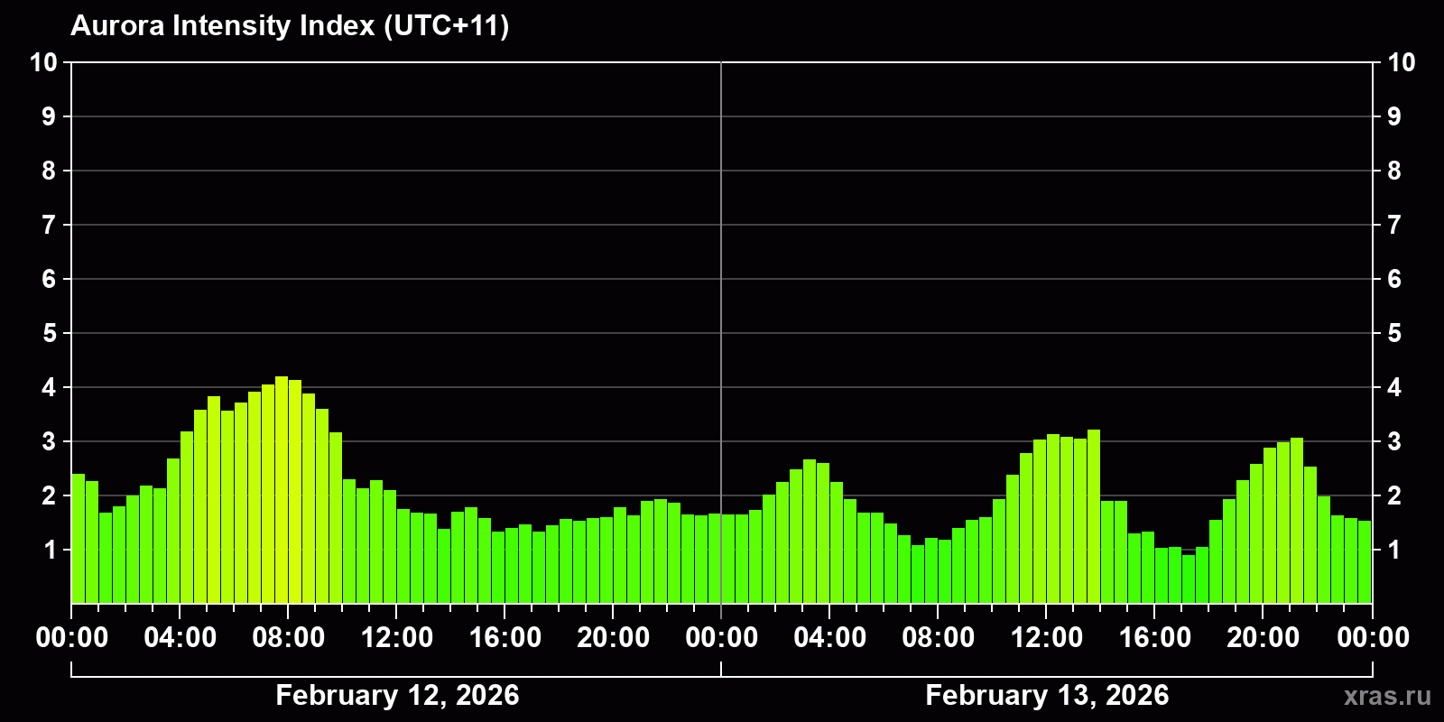 Auroral intensity index and the theoretically possible latitude of observations for nighttime in the Estern Hemisphere as of 2026-02-13 23:51 (end of day) local time