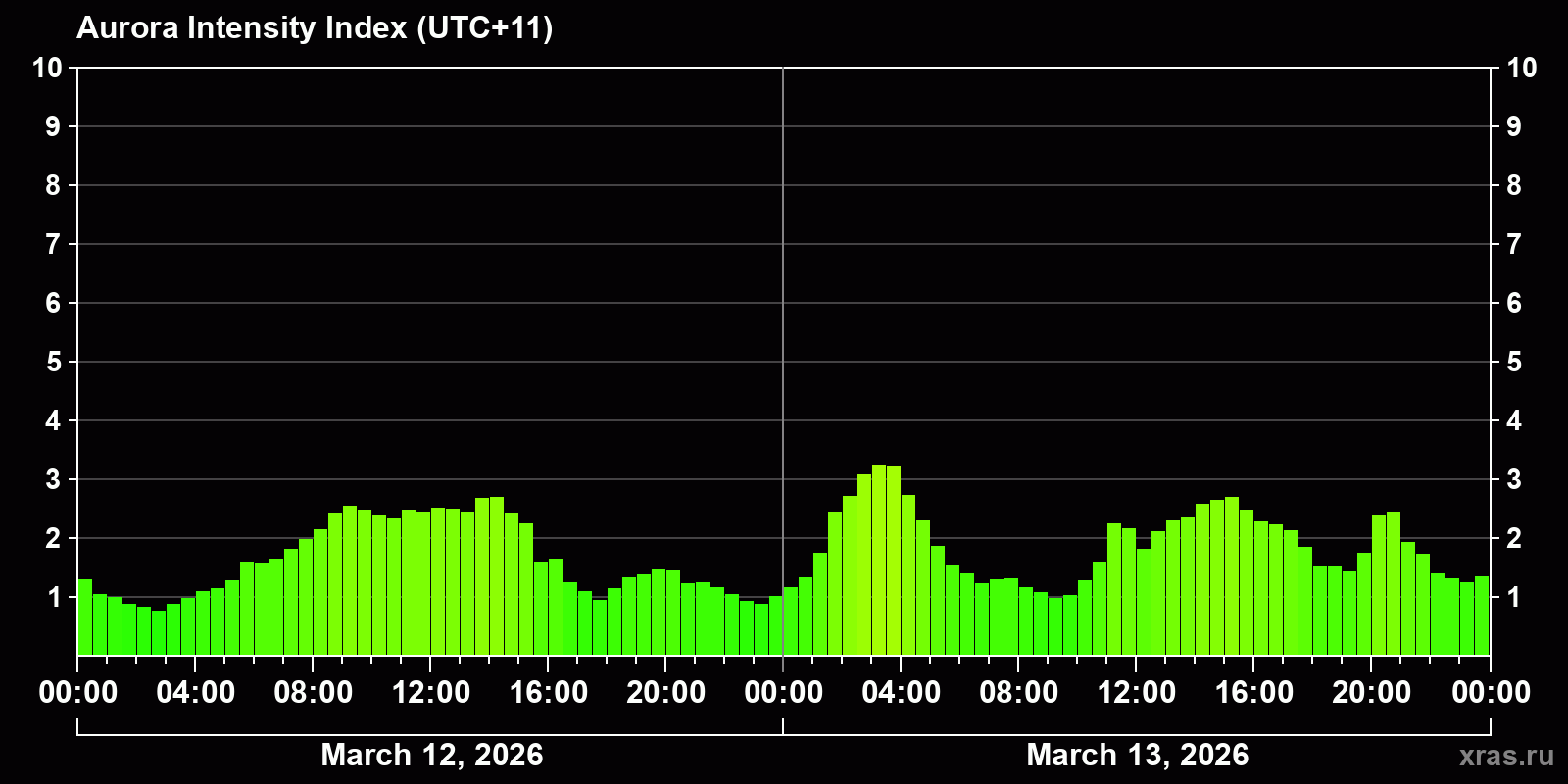 Changes in the auroral intensity index from 2026-03-12 to 2026-03-13 local time