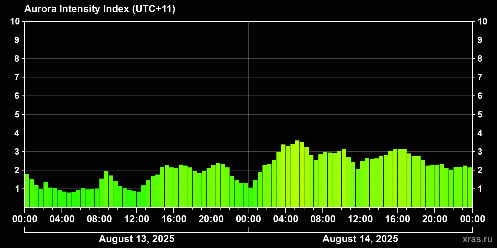 Changes in the auroral intensity index from 2025-08-13 to 2025-08-14 local time