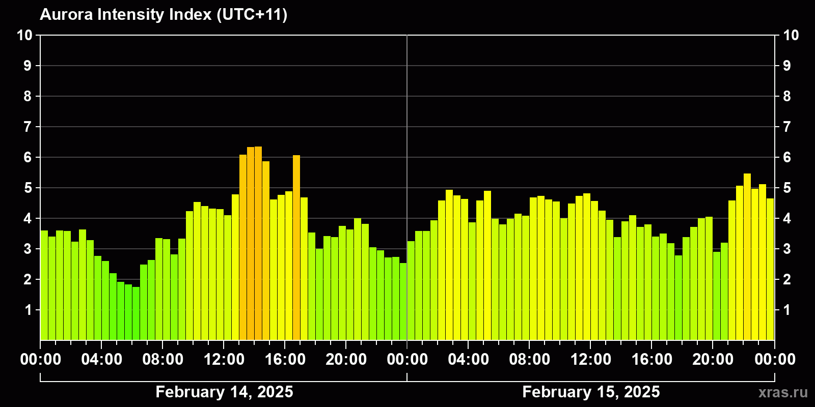 Changes in the auroral intensity index from 2025-02-14 to 2025-02-15 local time