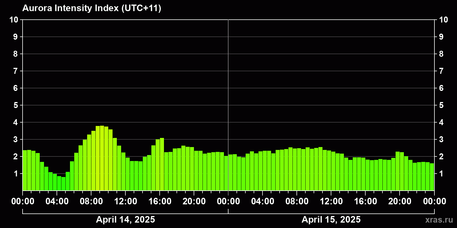 Changes in the auroral intensity index from 2025-04-14 to 2025-04-15 local time