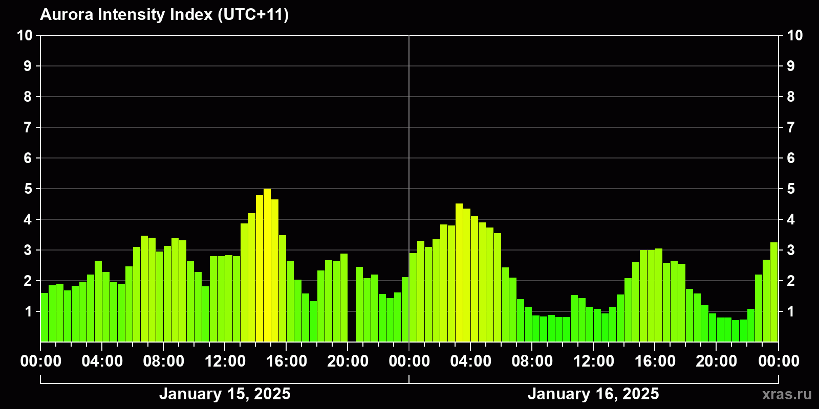Changes in the auroral intensity index from 2025-01-15 to 2025-01-16 local time