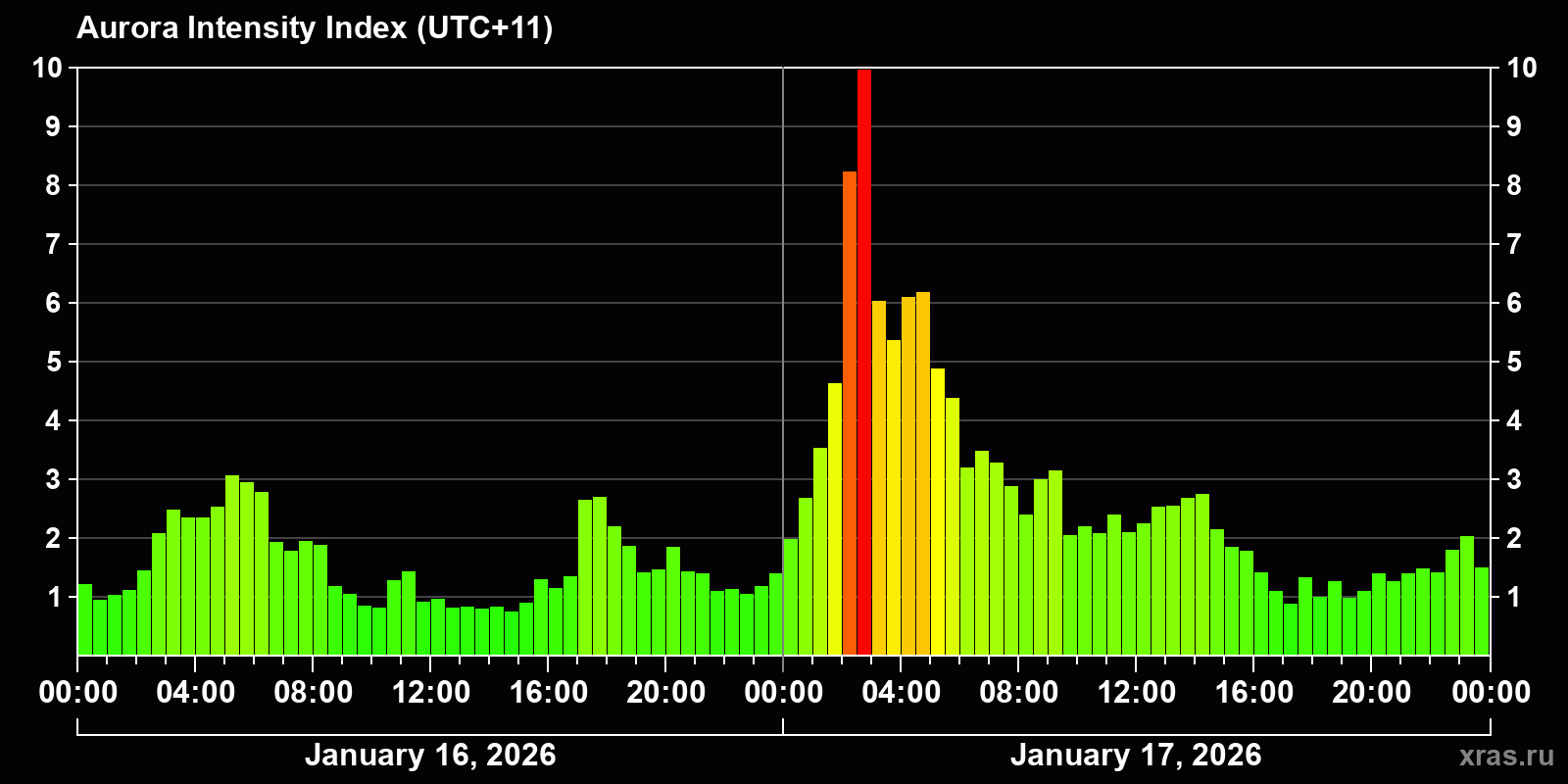 Changes in the auroral intensity index from 2026-01-16 to 2026-01-17 local time