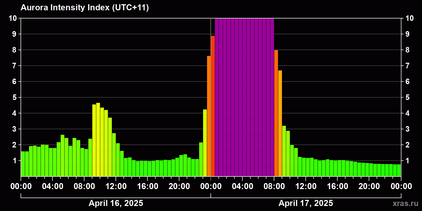 Changes in the auroral intensity index from 2025-04-16 to 2025-04-17 local time