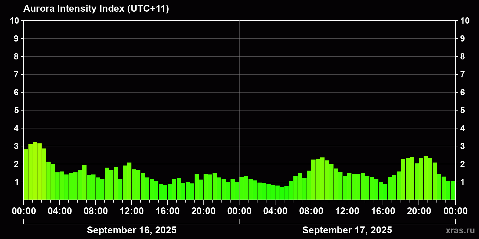 Changes in the auroral intensity index from 2025-09-16 to 2025-09-17 local time