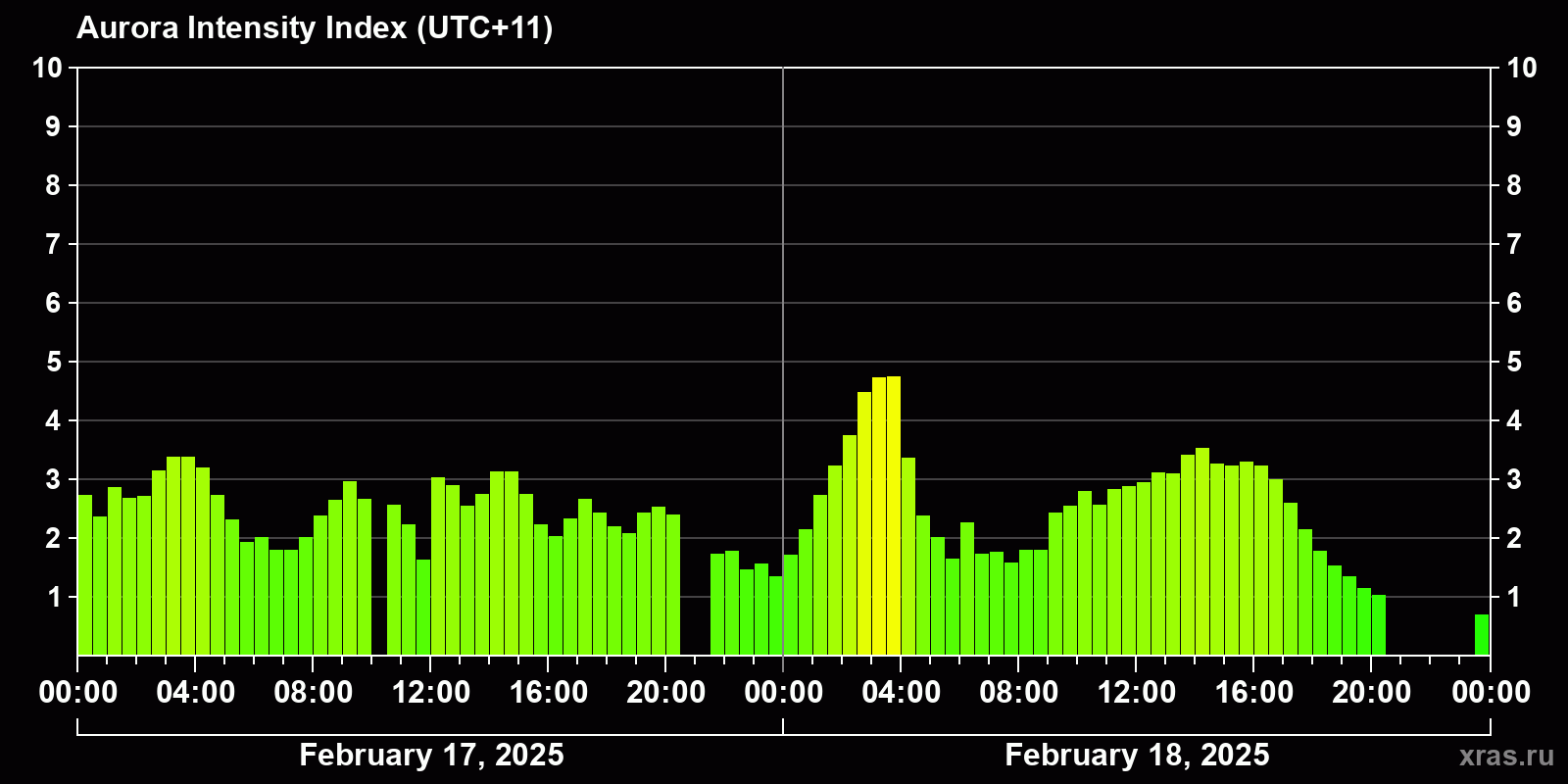 Auroral intensity index and the theoretically possible latitude of observations for nighttime in the Estern Hemisphere as of 2025-02-18 23:50 (end of day) local time